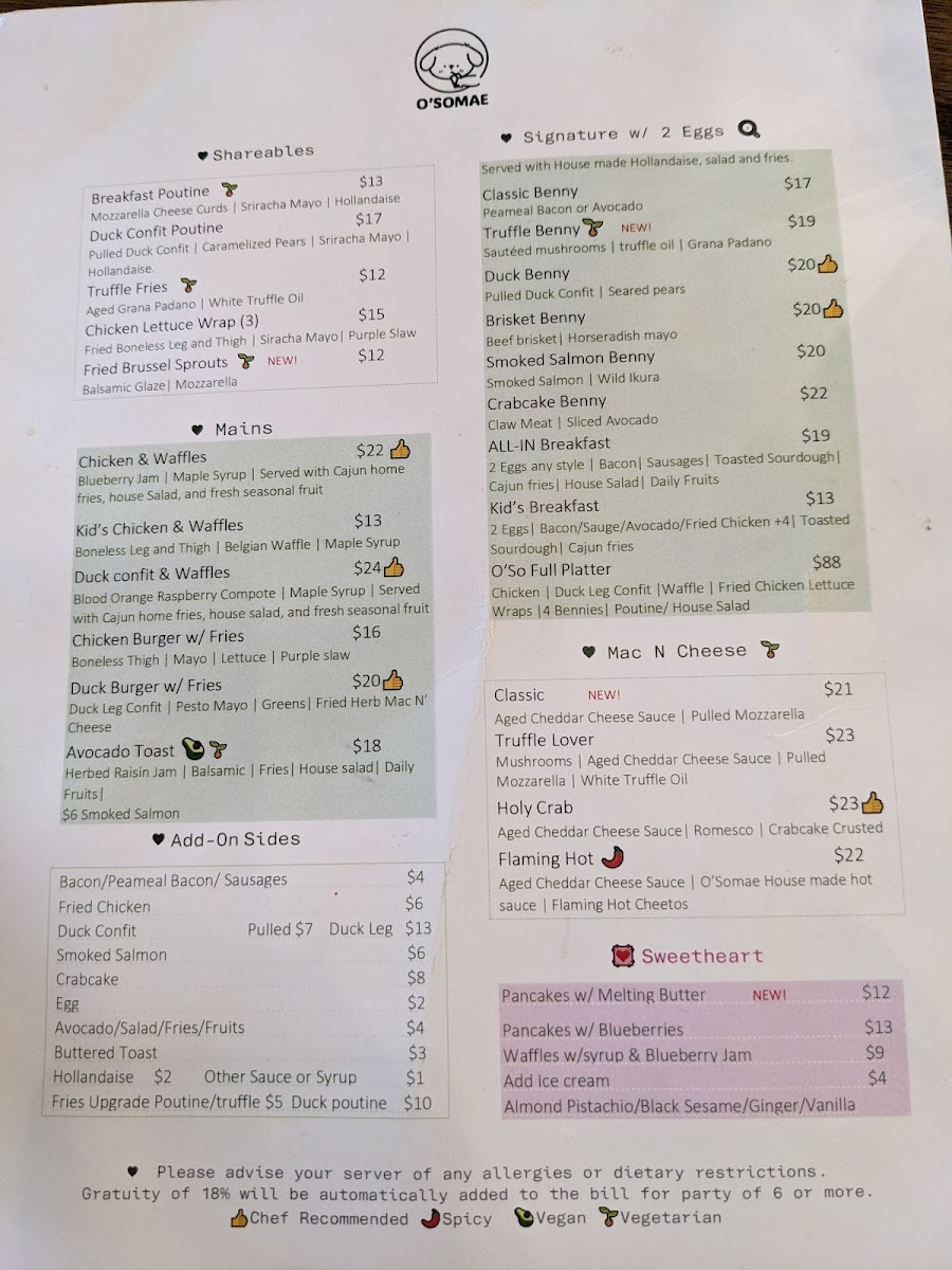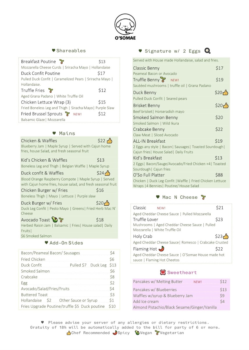At O'Somae, the menu is a delightful blend of classic and innovative dishes. Highlights include the renowned Classic Benny with an avocado twist, and the delectable ducker confit Eggs Benedict, celebrated as one of the best in the city. Drink options are equally impressive, featuring an extensive selection, including local craft beers.